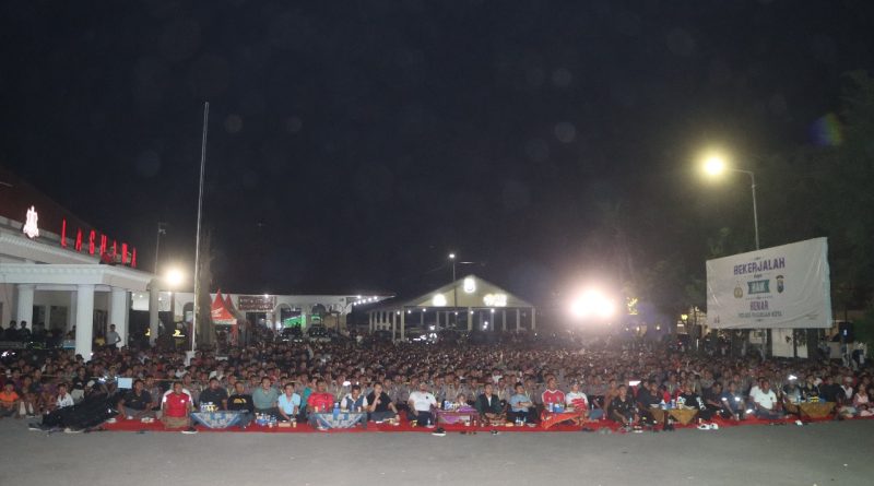 Nobar Polres Pasuruan Kota itu mengusung tagline “Pilkada Tanpa Konflik, Demokrasi Makin Asik.”